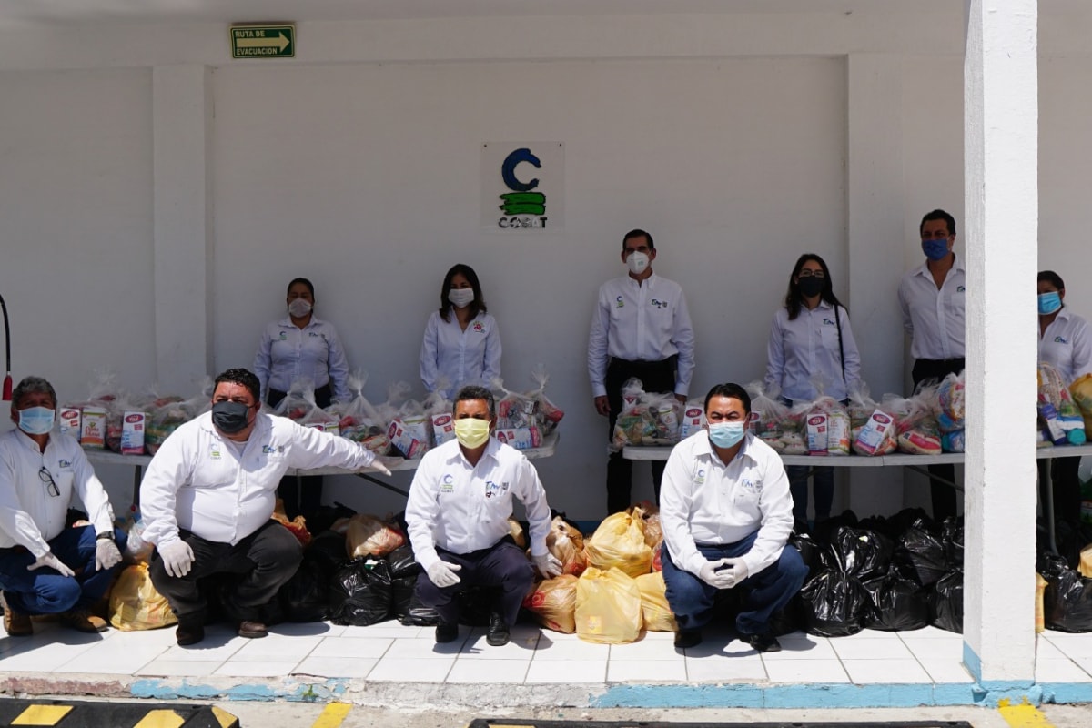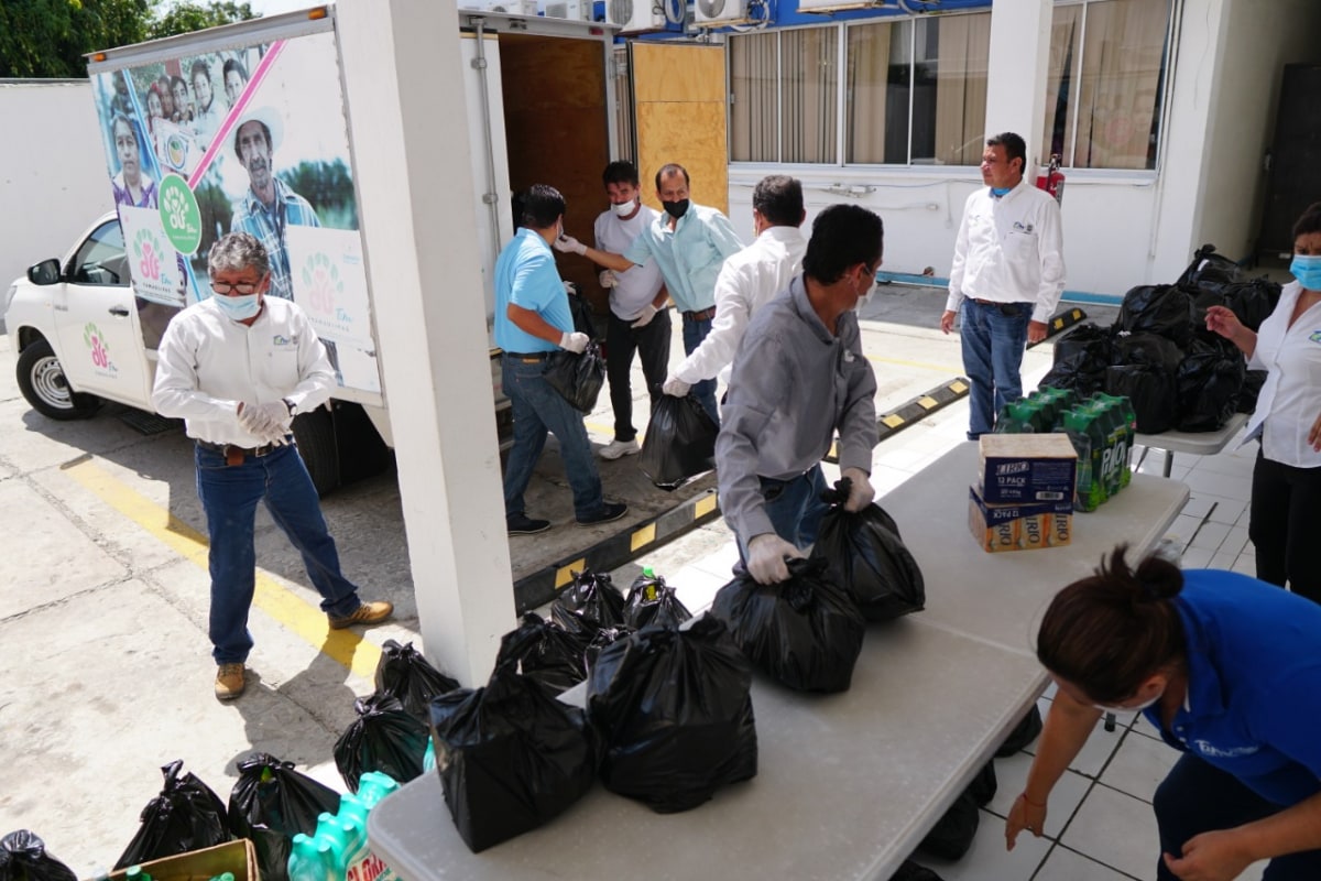 Cada paquete contiene artículos de la canasta básica familiar, entregando 997 despensas, 208 kit de limpieza, 1400 cubrebocas, 133 litros de gel antibacterial, 32 litros de pinol y 12 litros de cloro.