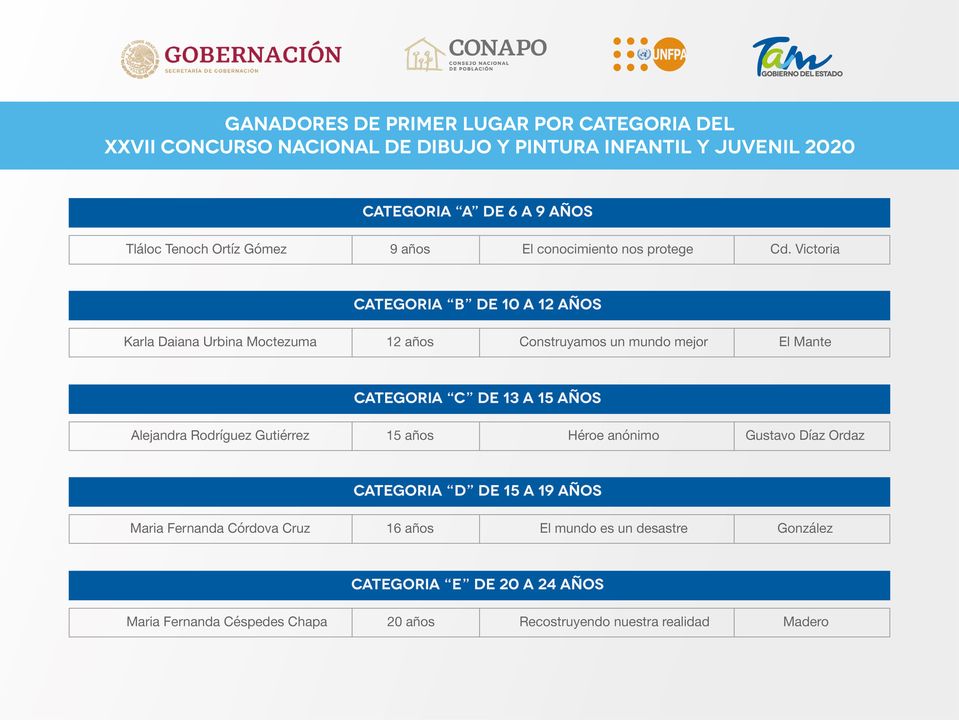 [ssba]El pasado viernes 2 de octubre se dieron a conocer los resultados del XXVII Concurso Nacional de Dibujo y Pintura Infantil y Juvenil 2020 por categoría, resultando ganadoras del Primer lugar en la Etapa Estatal, Alejandra Rodríguez Gutiérrez “Héroe Anónimo” del Plantel 09 Gustavo Díaz Ordaz, dentro de la categoría “C” de 13 a 15 años y María Fernanda Córdova Cruz “El mundo es un desastre” del Cemsadet 36 de Estación Manuel, González, dentro de la categoría “D” de 15 a 19 años, alumnas del Colegio de Bachilleres del Estado de Tamaulipas, quiénes pasan a la Etapa Nacional, los resultados del concurso nacional se darán a conocer el 16 de octubre del 2020 en los sitios de internet www.gob.mx/conapo y mexico.unfpa.org mientras que la ceremonia de premiación a nivel nacional se realizará el 30 de noviembre del 2020.