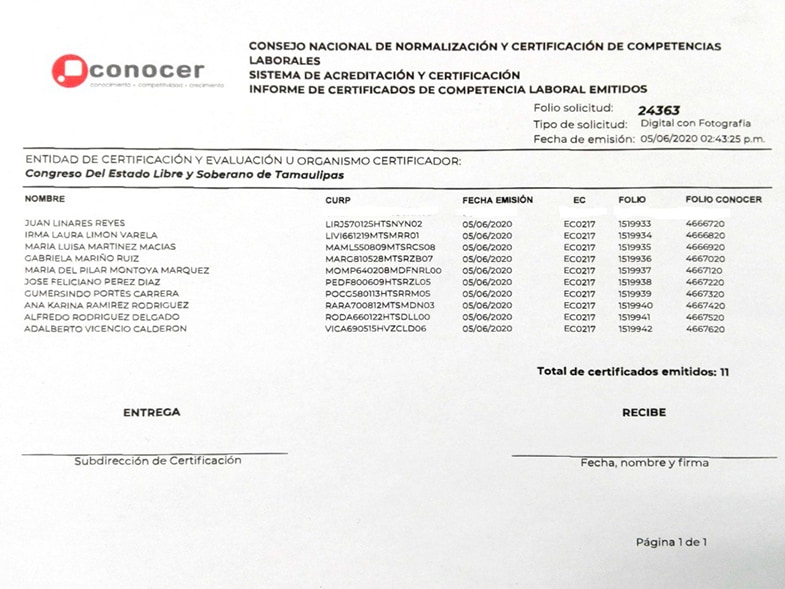 También se entregaron Certificaciones para la impartición de cursos de formación del capital humano al personal directivo presente, estos documentos son avalados por el Consejo Nacional de Normalización y Certificación de Competencias Laborales y el Congreso del Estado Libre y Soberano de Tamaulipas.