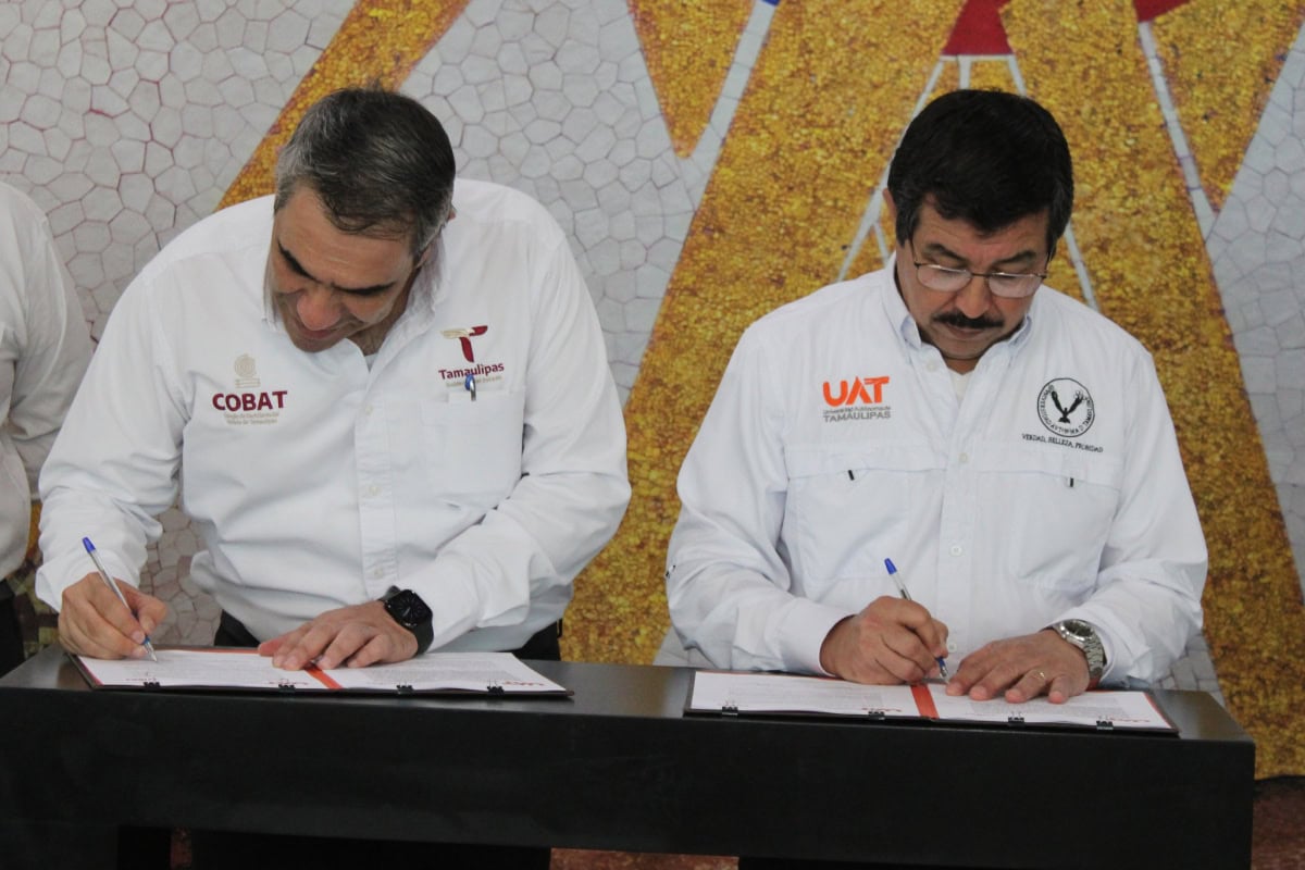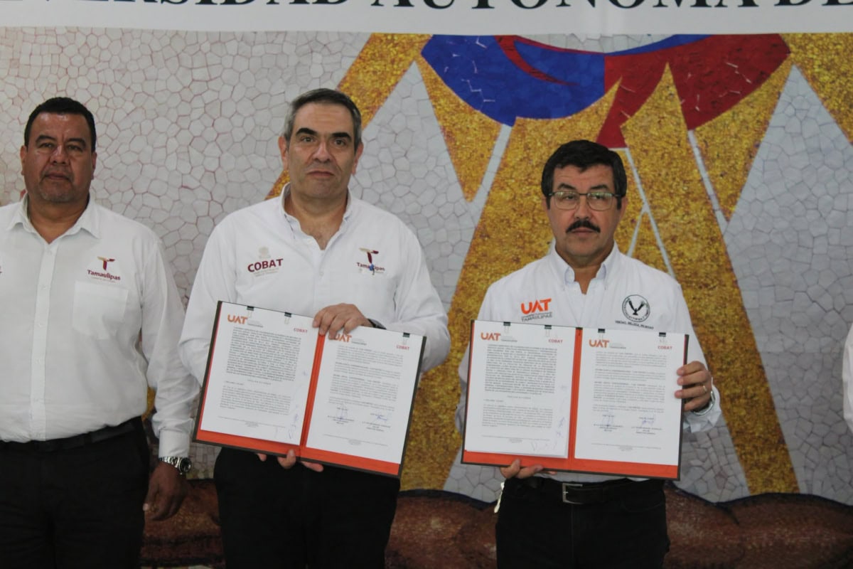 Ciudad Victoria, Tamaulipas.– Con el firme compromiso de impulsar el desarrollo académico y humano de la comunidad estudiantil, el Colegio de Bachilleres del Estado de Tamaulipas (COBAT) formalizó un convenio de colaboración con la Universidad Autónoma de Tamaulipas (UAT), que permitirá la incorporación de estudiantes universitarios en actividades de apoyo dentro de los centros educativos del subsistema.